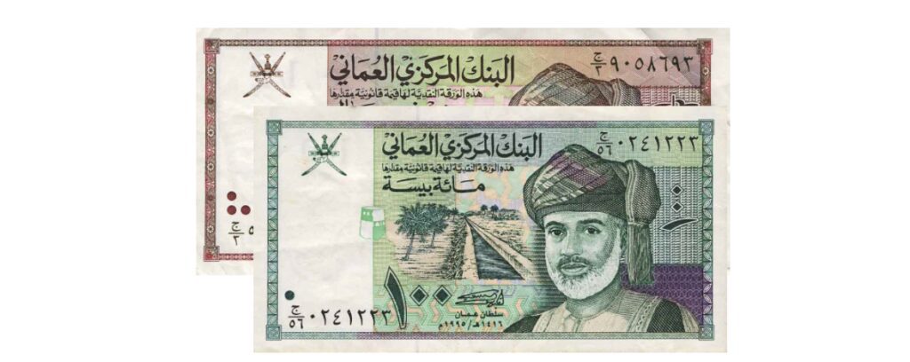 - Omani banknotes in denominations of OMR 1, 500 baisas, 200 baisas, and 100 baisas issued by the Central Bank of Oman in November 1995.