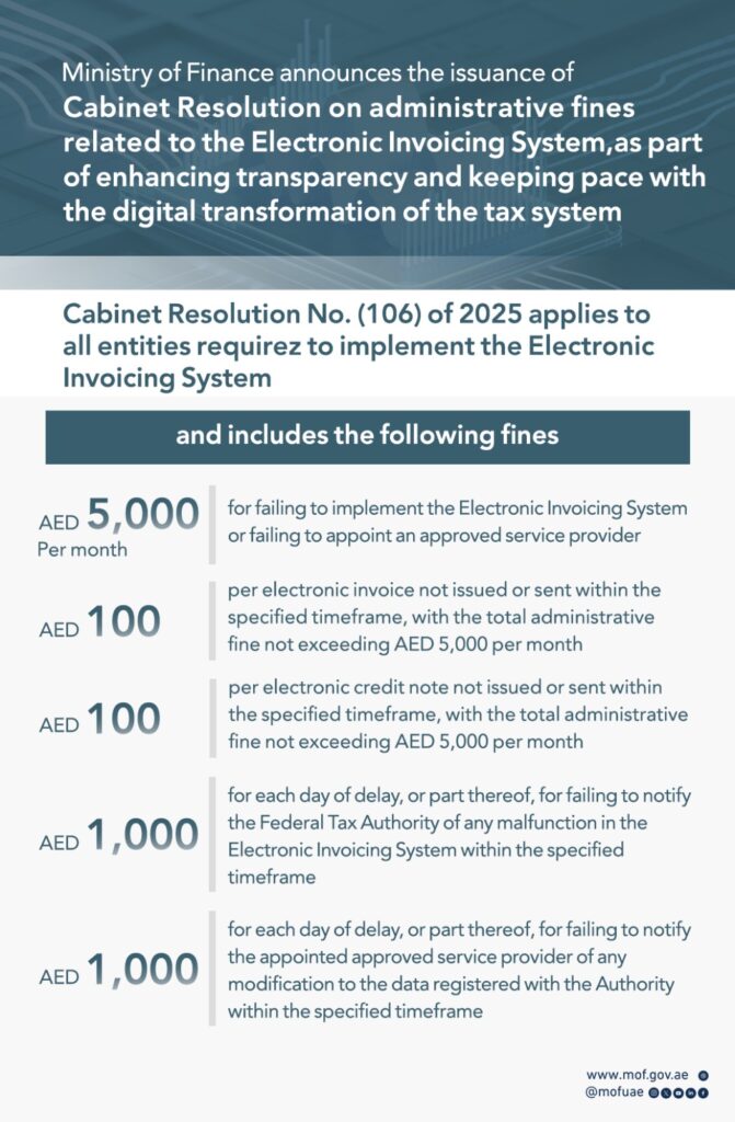 The Ministry of Finance announced the issuance of Cabinet Resolution No. (106) of 2025 regarding violations and administrative fines resulting from non-compliance with the legislation regulating the Electronic Invoicing System, as part of the UAE’s efforts to support the digital transformation journey and reinforce tax compliance in line with global best practices.